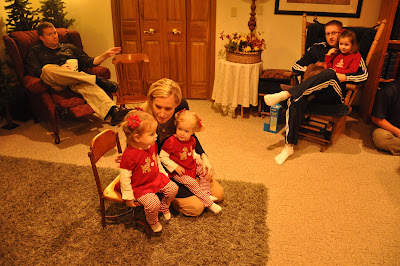 On Friday and Saturday we spend time with the Scudders, Fraziers, Chiazza's and Mimi and Papa. Saturday we were at Frazier's all day. I have to say, this is the first time ever that the girls were very good all day. It helped the older cousins were great in helping watch them, but this is the first time that I wasn't overly worried about them. Two years ago they were five month-old babies that needed fed, held, etc. Last year it was the stairs and they were new walkers that I worried about falls. This year, they played, well, actually. I think because there was enough older girls to play with them they got enough attention and didn't need to fight each other for attention. John fell asleep on the couch at one point in the afternoon. I was able to sit in the family room and enjoy talking with my in-laws. The girls did not get a nap and were even OK in church that evening. Maybe, just maybe, we are turning a corner...