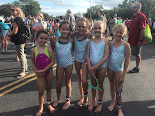 The girls participated in their second triathlon tonight. Jack wasn't able to because he had golf practice. They did a 75 meter swim, 2 mile bike and 0.6 mile run. Anna finished 4th in her age group, with a total time of 16:43.87. Her swim was 3:16/100y rate, bike was 14.0 mph and her run was 7:32/mile pace. Kate finished 5th in her age group right behind Anna with a total time of 17:06.86. Her swim was 3:14/100y, bike was 13.0 mph and run was 7:38/mile pace. Elizabeth finished 10th with a total time of 19:25.27. Her swim was 3:14/100y, bike was 11.0 mph and run was 8:24/mile pace.