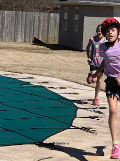 We did an obstacle course today for some good exercise and good old competition. The kids had to dribble the basketball around the cup-de-sac, then make 3 baskets, 10 pushups and 10 sit ups, run to backyard, climb up slide and go down, ran to bike and go around the block (0.7 mile). They tried to beat their own times, but each other too. Kate ended up with the fastest time around 4:38. Jack was close to beating her on the last round, but his bike handle fell forward so he had to get off his bike and fix it. He finished about 10 seconds behind her.