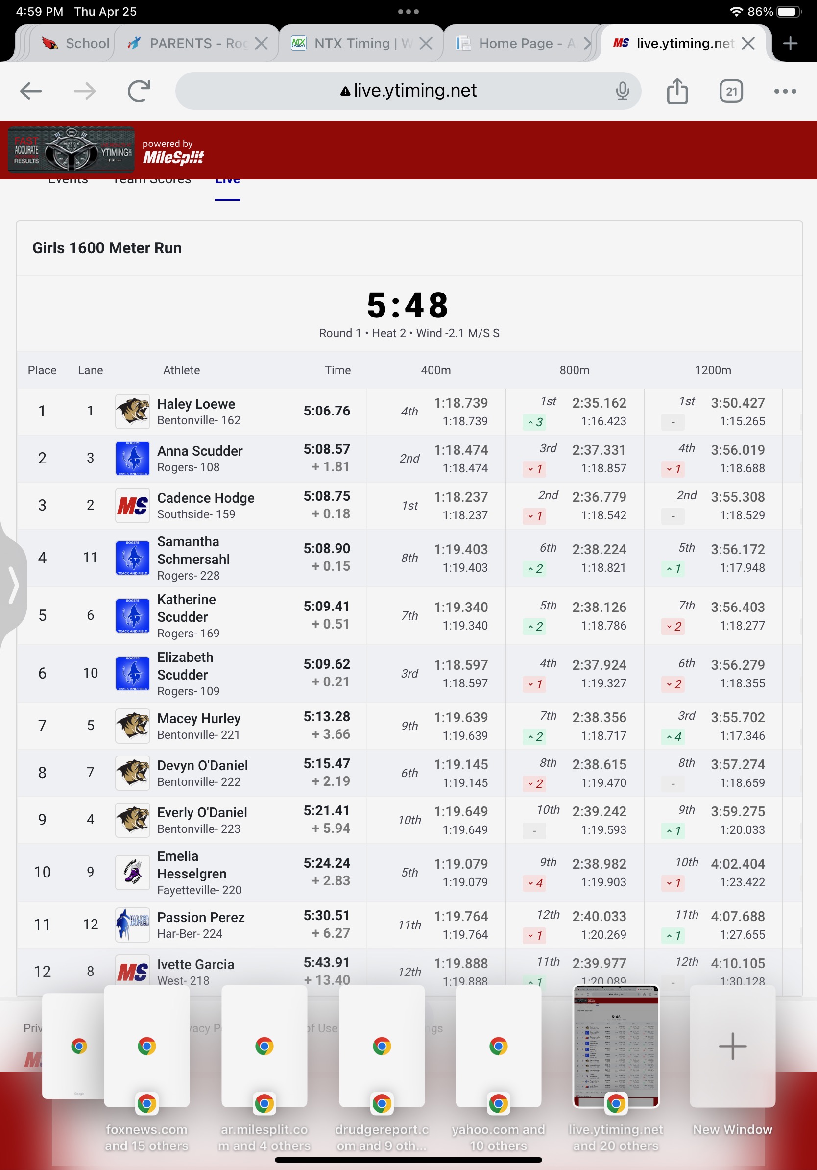 The girls ran in the conference meet tonight. They all rean big PRs in the 1600m and now there are 6 RHS girls in the top 10 in the state of Arkansas in the 1600m! Anna is considered all-conference because she finished second in the 1600 (5:08.57). Anna qualified in the 400m (finishing 6th--1:01.13) and she ran this about 30 minutes after she ran her fast mile. Kate ran the 800m (2:21.70) for the first time this outdoor season, finishing 3rd and qualifying her to state. Her 1600 was a 5:09.41. Elizabeth ran the 400m for fun--1:04.17 (25 minutes after her fast mile (5:09.62) and set a PR). Anna's split in the 4x4 was around 62 seconds. Rogers girls team finished runners-up!